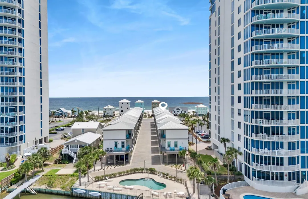 Gasten kunnen genieten van een kust uitzicht op de zee vanaf een terras in deze 3-slaapkamer Little Lagoon Gulf Shores villa, binnen 12 minuten te voet van Big Beach Studios.